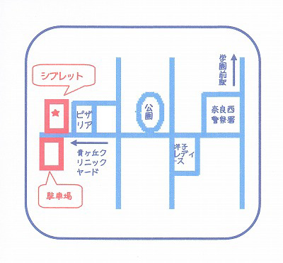 | ○お車でお越しの場合 阪奈道路学園前 ICより、北へ150m、奈良西警察を左折し、だいわ通り約300m。 ○バスでお越しの場合 近鉄学園前駅より、南口21、22、26番バスに乗車し学園大和町3丁目下車後、西へ徒歩50m。 |